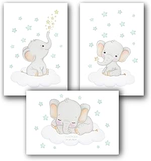 KidsCuteDecorations Babyzimmer Bild Elefant A4 | 3er Set Kinderzimmer Poster Mint | Wanddeko Baby Jungen | Personalisiert Bilder Kinder | Wandbilder für Kind DIN A3 | Kinderposter Tiere | Tiermotive